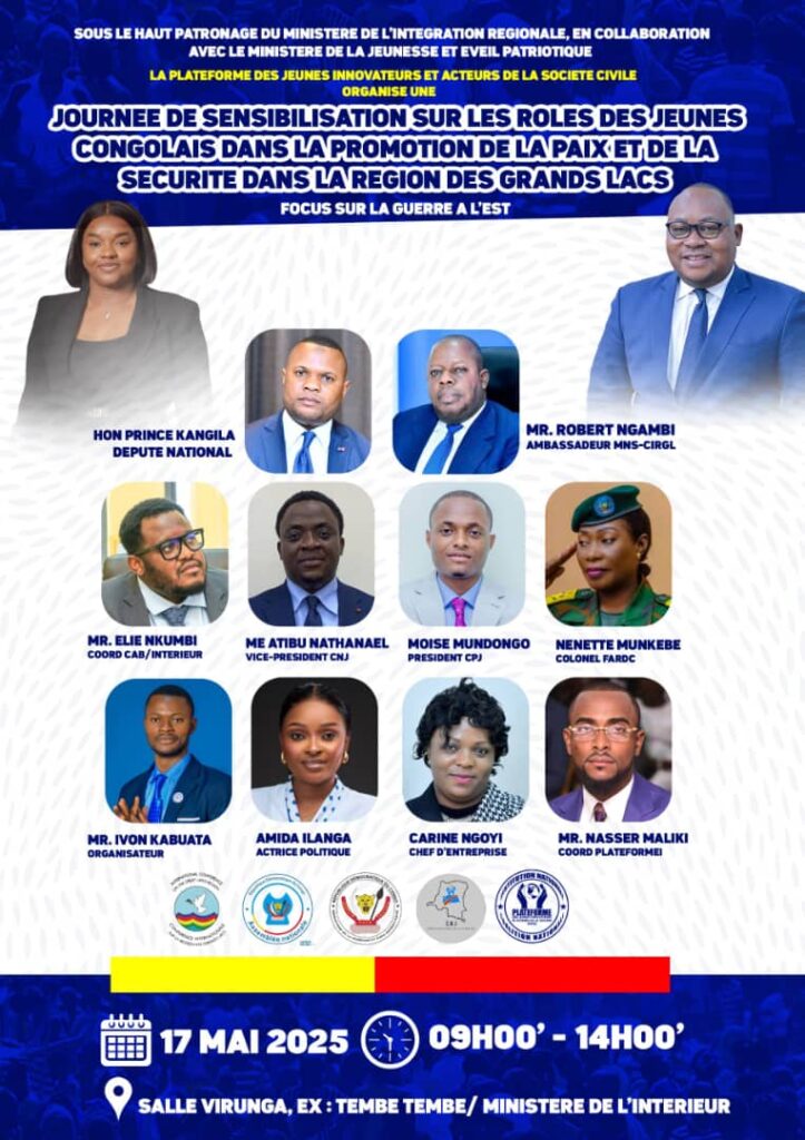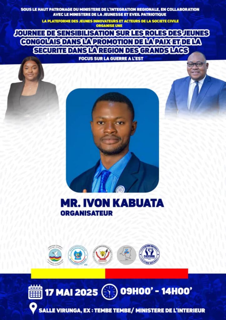 Kinshasa, 18 avril 2025 – Le 17 mai prochain, la salle Virunga, située dans l’immeuble du Ministère de l’Intérieur (ex Tembe na Tembe), accueillera une journée exceptionnelle placée sous le signe de la connaissance, de l’engagement et de la responsabilisation de la jeunesse congolaise et de la région des Grands Lacs.